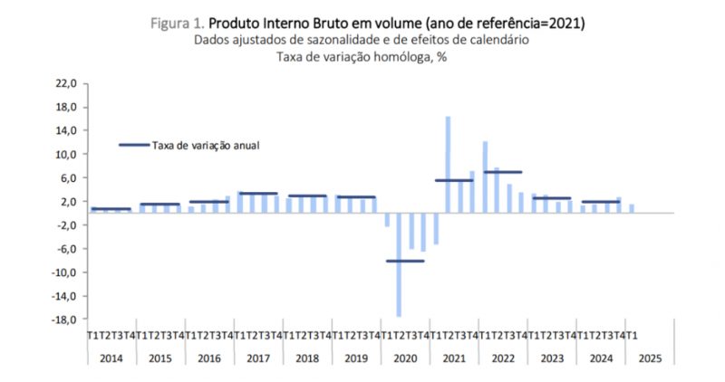 A economia portuguesa cresceu 1,6% no primeiro trimestre de 2025 (dados preliminares), em termos homólogos, uma desaceleração face aos 2,8% (homólogos, revistos) do trimestre anterior.